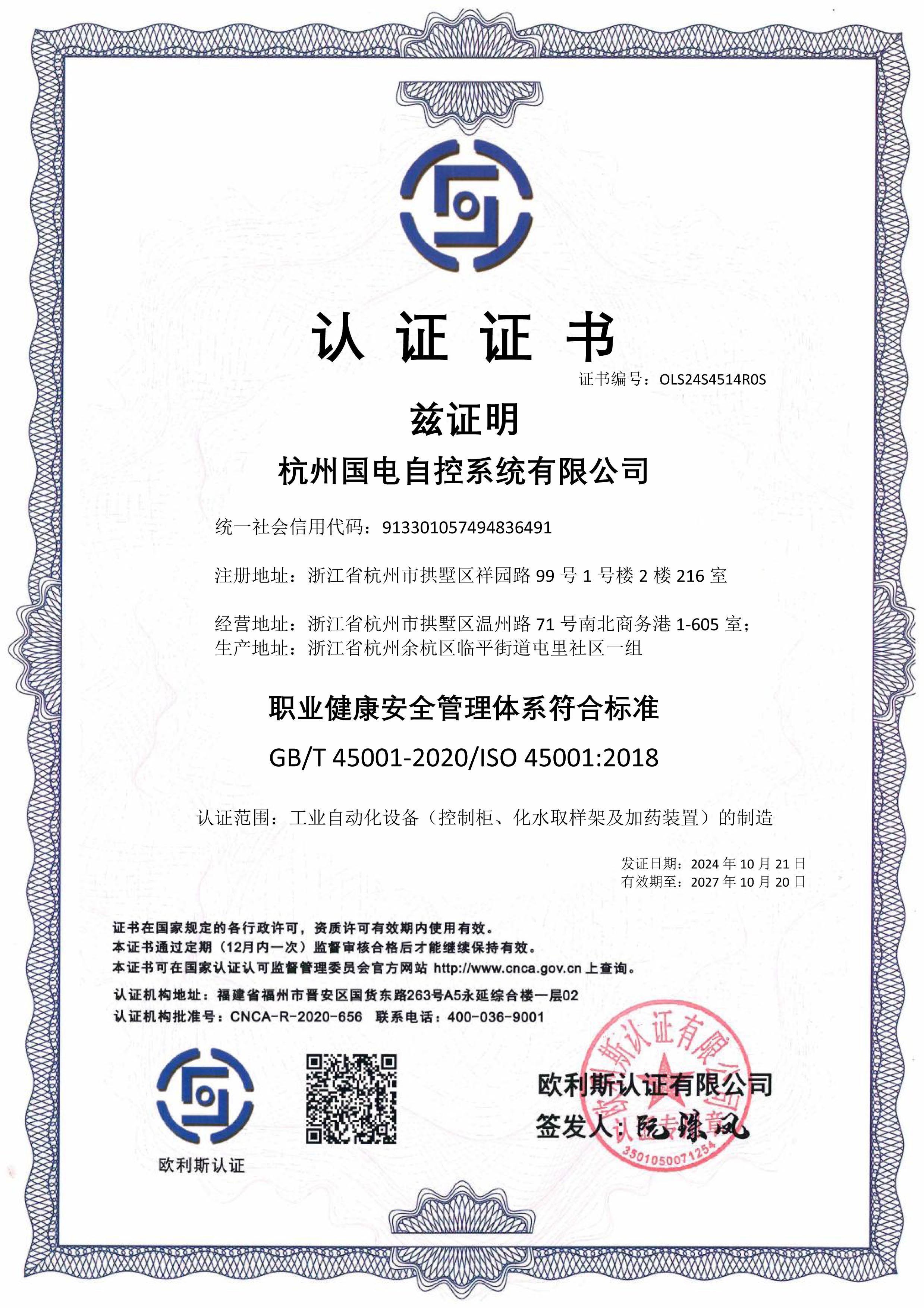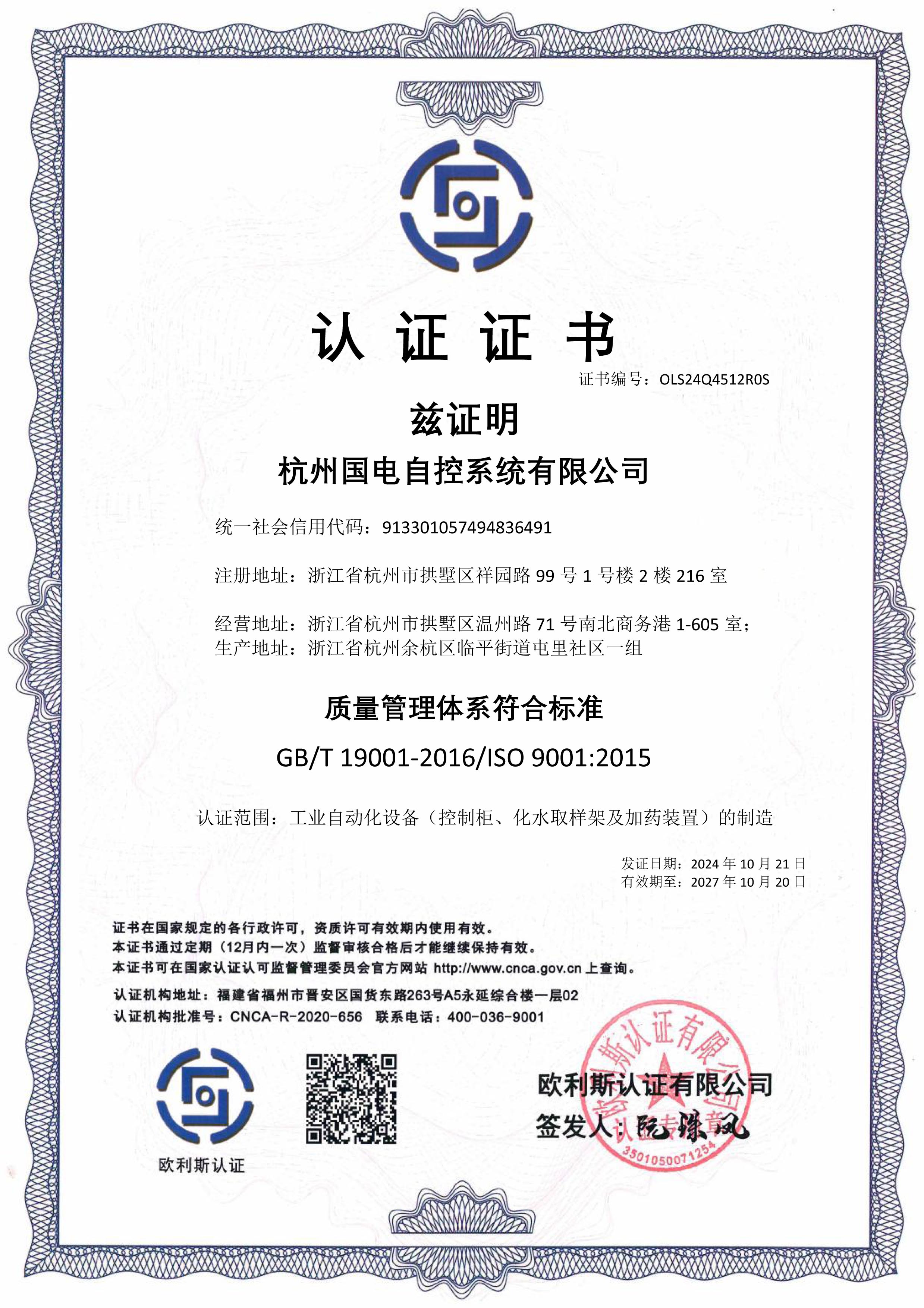 认证范围:工业自动化设备(控制柜、化水取样架及加药装置)的制造